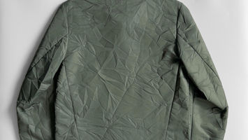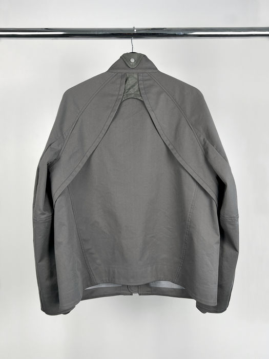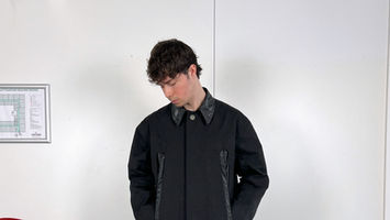 Technical Ribbed Jacket in a washed nylon fabric with ribbed hems and a slim silouette. Technical details and a removable pouch that can be used as an inner pocket or a chest pocket. Hidden zipper pocket at underarm seam. Ribbed hems and collar. Zipper closure. Signature splits in the elbows and center-back and 3D printed ‘M’ button at right side-seam pocket.