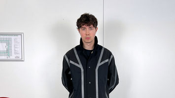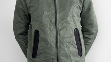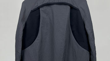 A 3-button jacket in washed nylon featuring a multitude of technical details and organically displaced seams; A modern and highly functional take on the classic suit jacket silhouette. Featuring a smooth draping, waterreppellent, washed nylon with contrast panelling. A three button closure with 3d printed signature top button. Two vertical chest pockets that can open up to maximize wearability. A contrasting, organically shaped sidepanel that functions as a deep frontal pocket, while the back of the sidepanel functions as a shoulder gusset, maximizing wearability once again.