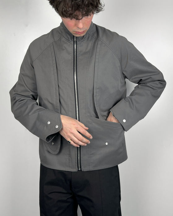 To add some contrast I used a green tyvek fabric for the chest pocket and undercollar. The texture and shine on the fabric remind me of a specific type of leaf. Some additional functionalities include; Elastic hems throughout. Lapped waist pockets with black zippers. A quick-release main zipper.