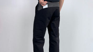 Work-pant in a brushed Poly Cotton fabric. Wide Leg. Featuring signature splits at the knees with stretchy ribbed facing to maintain easy movement. Two welted pockets at the back with a pleated fold at the right side for added security. Four side-pockets with double layered pocket bags that extend towards the knees, accessible via a hidden side-seam zipper. Signature 3D printed ‘M’ button attached by hand. Fully bound seams throughout complete garment.