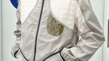 A functional jacket paying homage to nature’s mesmerizing textures. The main fabric is a heat reactive nylon that acts as a metaphor to natures sense of living, the changing of the seasons, etc. For the back, chest and underarm panels I used a cream coloured mesh that functions as ventilation and refers to patterns found on different types of trees.