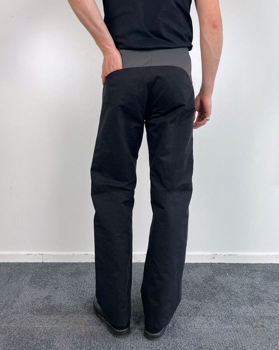 Wide fit technical work pants with a more fitted waist and hip silhouette. Featuring a displaced side-seam that functions as a side pocket and disappears into the back of the knee where a slight dart is added to follow the natural bend of the knee. A signature split knee with contrast facing cut on bias for added mobility. Organically shaped back yoke with two integrated back pockets. Taped seams throughout. Zipped closure with single pressbutton. Handstamped label in waistband.