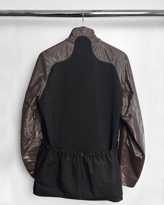 A reimagined M-51 Field jacket featuring technical fabrics, contemporary shapes and an ultra-wide waist pocket. The main body sees a water-repellent black brushed twill while the sleeves and shoulder feature a brown tyvek fabric that repels water like no other fabric does while still remaining light and agile. Two big chest pockets with added depth thanks to a stroke of brown tyvek. Entry via vertical welts. One big waist pocket wraps around entire body and can be tightened using elasticated cord. Executed in black ripstop for added durability. Style line on the back of the jacket follows the natural shape of the human body. Additional detail include a press button closure, shaped standing collar with throat latch, a fully lined inner, adjustable cuffs and a handstamped neck label